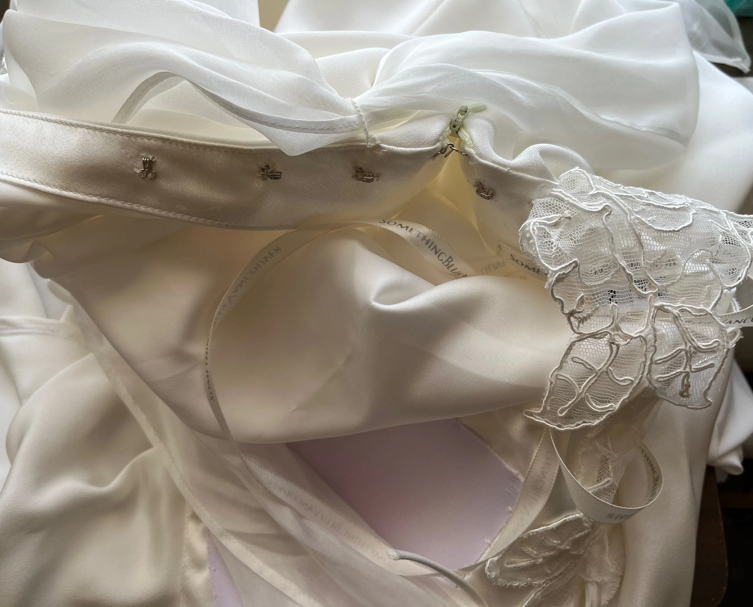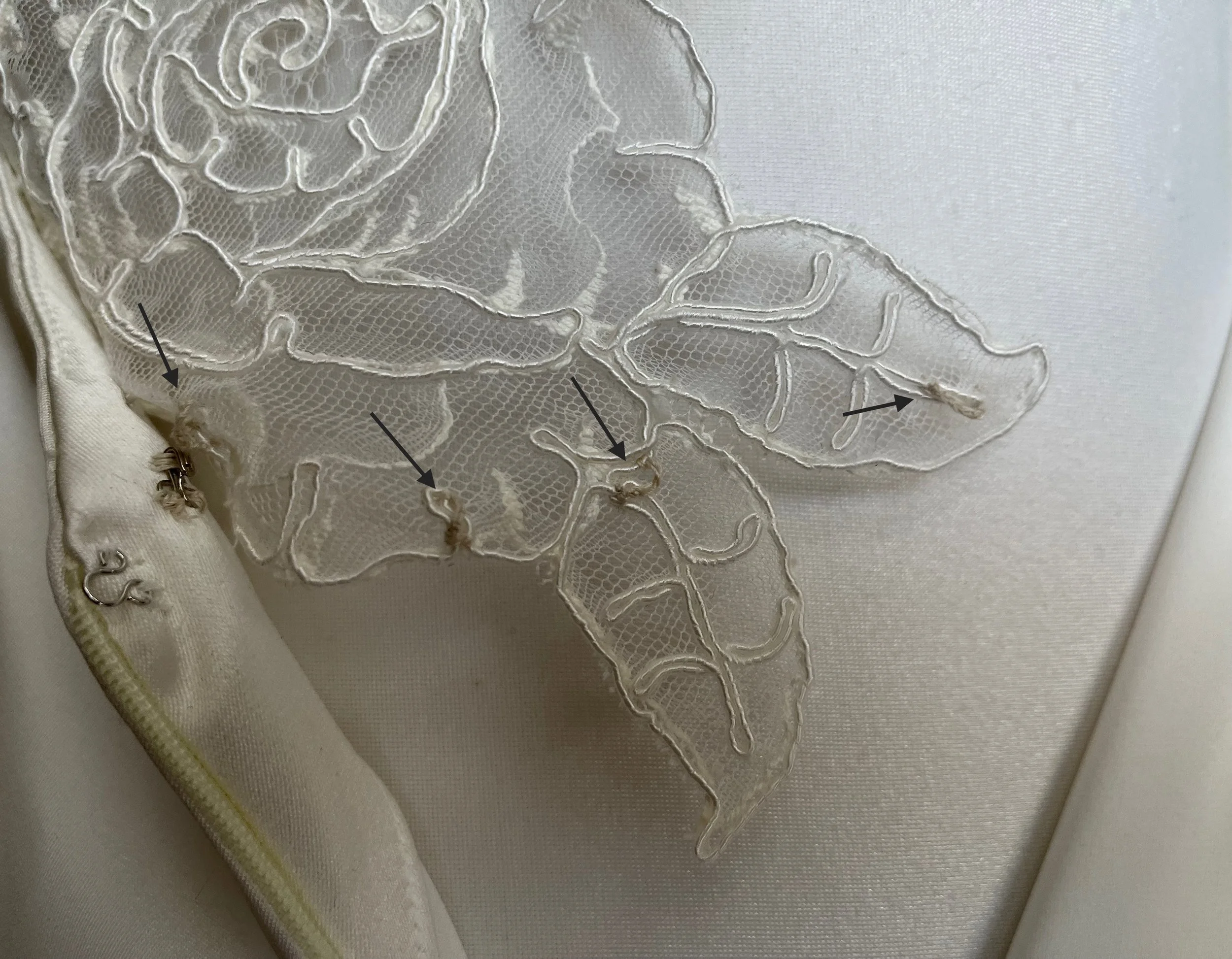 Adjusting bodice interior with boning and layers. Careful handling, removal, and retouching lace and applique by hand before and after dress alterations,